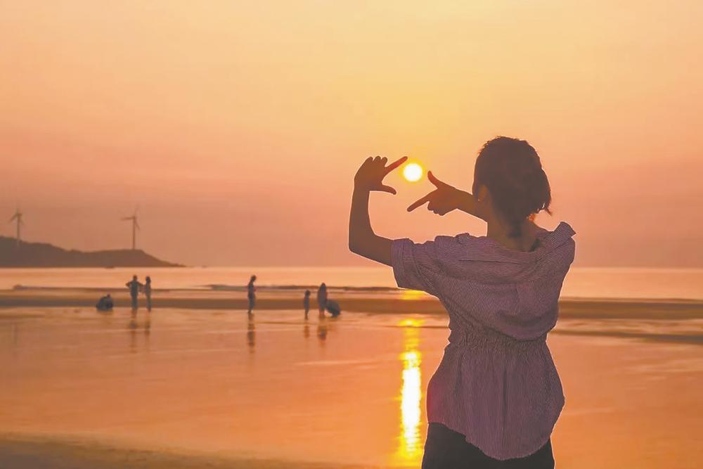 职工在漳浦海滩拍照留念。(资料图片)