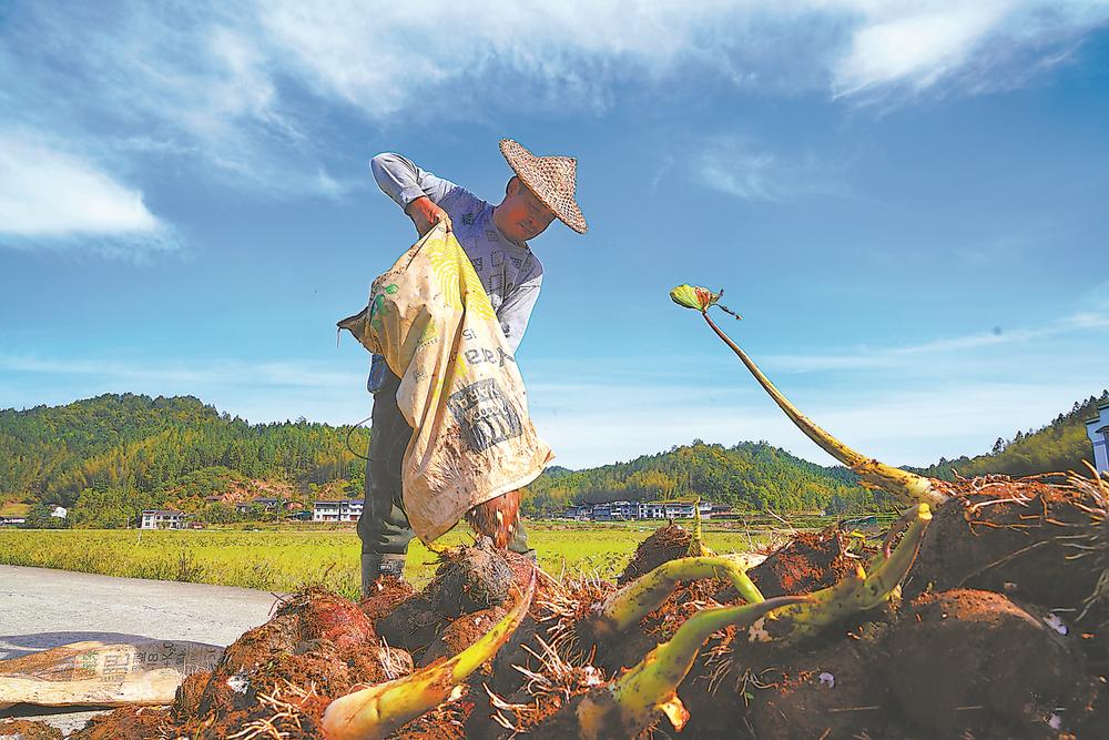 29日,泰宁县下渠镇大湖村百亩槟榔芋种植基地内,20余名农户正忙着挖芋、装筐、搬运……个头均匀、体型圆润的芋头很快堆满了田垄,又装车销往厦门、广州、上海等地。