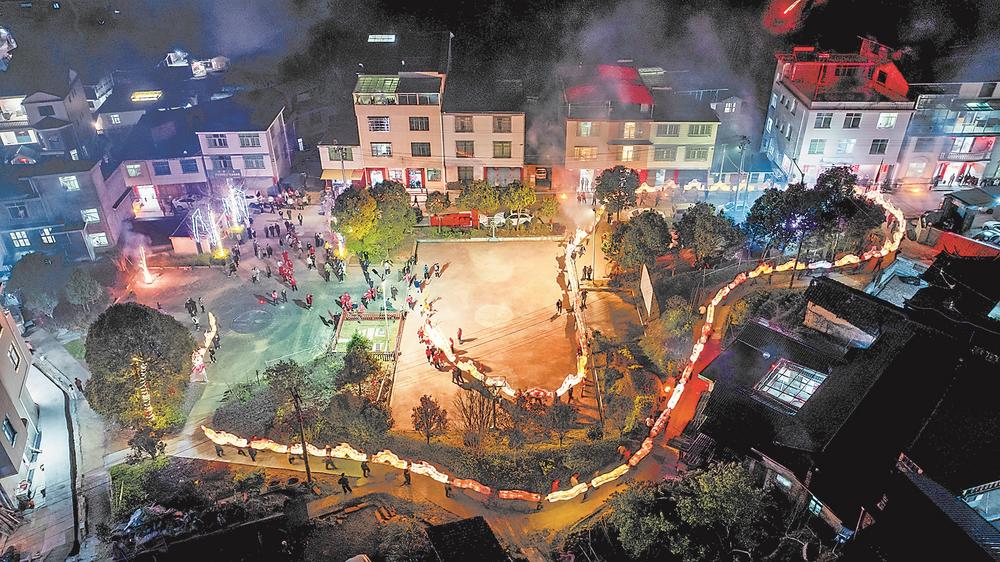 19日晚6时许,山村灯火渐次亮起。伴随着震耳的爆竹声和绚烂绽放的烟花,一条长达260余米、由58节龙灯连接而成的长龙在村中蜿蜒而起。青壮年村民扛着长龙,在古村巷道中穿梭游弋,龙身随着步伐起伏翻腾,在夜色中流光溢彩(上图)。