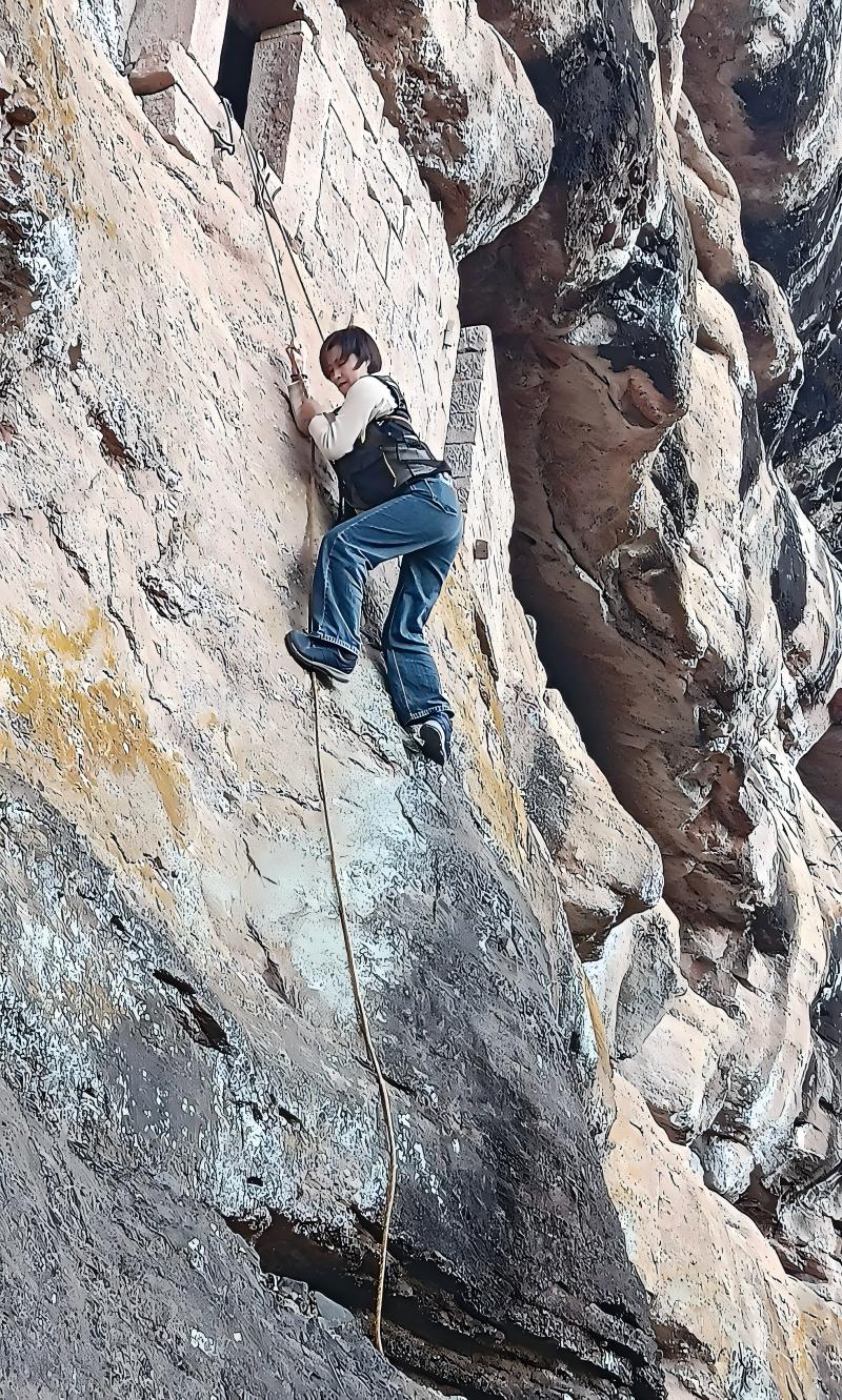在金鸡山古崖洞开展野外调查时,武夷山市普查队分队长逄博如吊着绳索攀登悬崖。(本文图片均由受访者提供)
