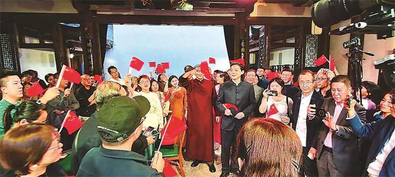 当主题曲的旋律在古厝中缓缓响起,刚刚经历历史的观众在演员带领下不由自主地加入演唱,歌声汇聚成一片深情的海洋,全场高举国旗,同声齐呼“祖国万岁”。