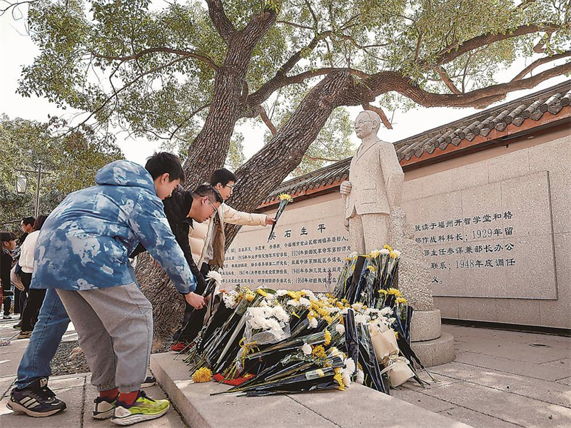 “你们现在能在明亮的教室里安心学习,得感谢我们伟大的祖国,感谢像吴石将军这样的革命先烈为我们创造了条件。”在吴石将军雕像前,福州市民郑晶晶和两个孩子手持鲜花,鞠躬致敬。