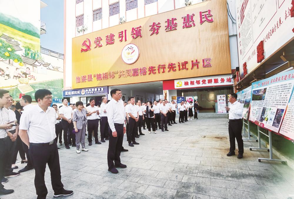 10月25日,仙游县四套班子成员及县直有关部门,各乡镇(街道)党政主要领导,各管委会主任来到度尾镇“柚相邻”共同富裕先行先试片区,深入基层一线调研,实地察看基层社会治理中心、党建共富中心、产业能级提升中心、非遗文化传承中心、人才服务中心、智慧康养服务中心和共富护航中心建设进度,了解“柚相邻”片区党委工作模式,学习“强化优势互补、推进多元联动、实现共建共治共享”经验做法。
