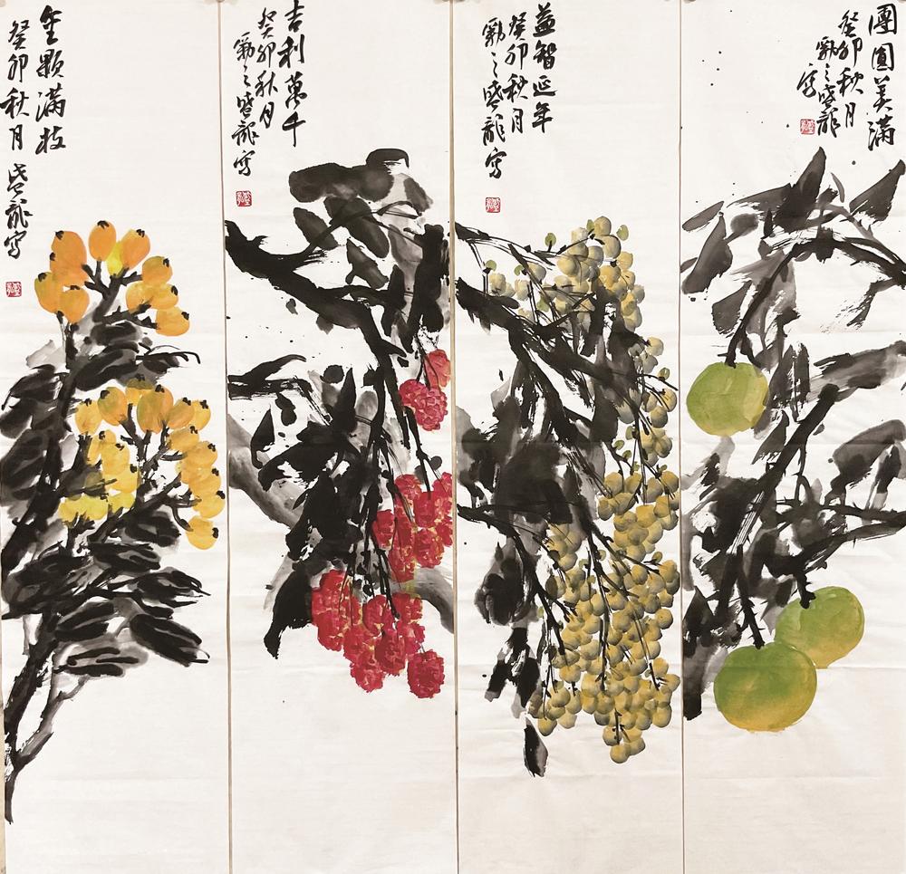 “说有万里山,隔阻两地遥。不需见面,心中也知晓。”郑盛龙离乡30余年,在外时常会想起家乡的风物,便以莆田“四大名果”——荔枝、龙眼、枇杷和文旦柚作为题材,进行国画创作。