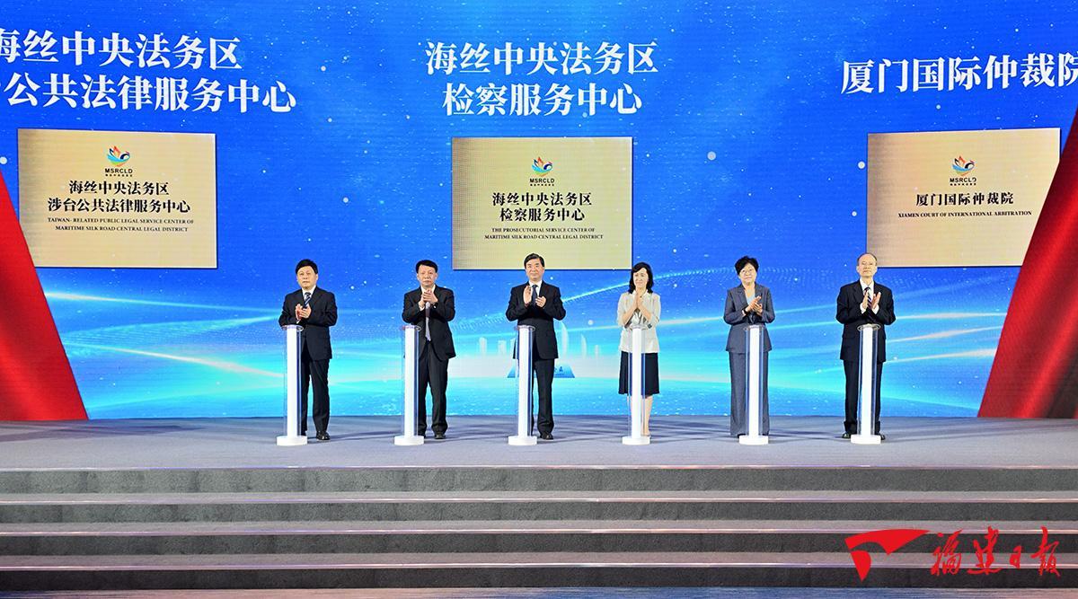 周祖翼和与会嘉宾代表共同为“海丝中央法务区检察服务中心”“海丝中央法务区涉台公共法律服务中心”“厦门国际仲裁院”揭牌。