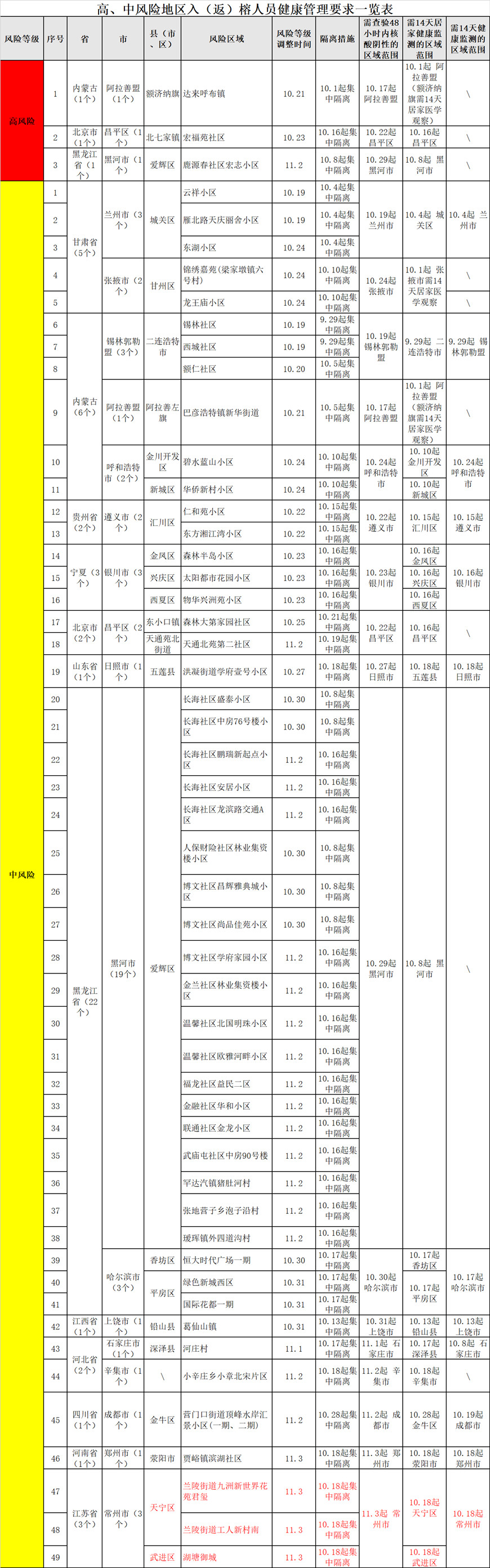 一、我市对从高、中风险地区以及重点关注地区入(返)榕的人员按规定采取健康管理措施,具体要求详见附表。凡10月1日以来有内蒙古阿拉善盟额济纳旗达来呼布镇桐楠阁餐厅旅居史的按照密切接触者管理,共同生活的家庭成员按次密管控;凡10月13日(含)以来有江西上饶葛仙村度假景区仙村客驿餐厅及可能轨迹重叠的入(返)榕人员按照密切接触者管理,共同生活的家庭成员按次密管控;凡10月30日、31日有上海迪士尼乐园和迪士尼小镇旅居史的入(返)榕人员需进行7天居家隔离+7天居家健康监测。