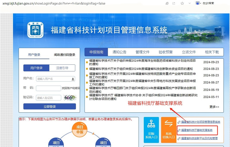 2、人员(专家)、单位使用原或现注册的账号和密码通过福建省科技计划项目管理信息系统首页(http://xmgl.kjt.fujian.gov.cn/showLoginPage.do?)上的系统切换入口登录"福建省科技厅基础支撑系统"进行信息维护和信息变更申请,如信息处于起草或退回修改状态,请通过列表上的提交功能提交审核。