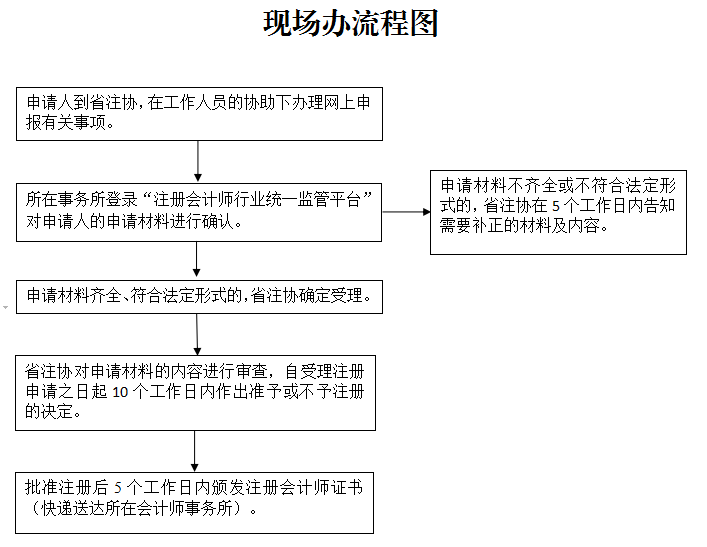 省级注册会计师协会收到申请人提交的申请材料后,对其进行形式审查。申请材料不齐全或者不符合法定形式的,当场或者在5个工作日内一次性告知需要补充的材料及内容。申请材料齐全,符合法定形式的,受理其注册申请。