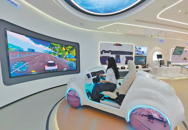 A woman tries out a driving simulator at an exhibition hall of Xiamen Tianma Display Technology. CHINA DAILY