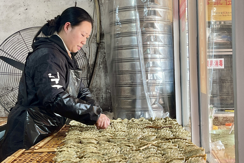 At 4 am, while most of Shaowu in northern Fujian province is still asleep, steam rises from Cai Minjun's shop. Inside, a dozen women sit around long tables in the fluorescent-lit workspace, pinching, folding, and sealing to transform lumps of dark-speckled rice dough into crescent-shaped dumplings.