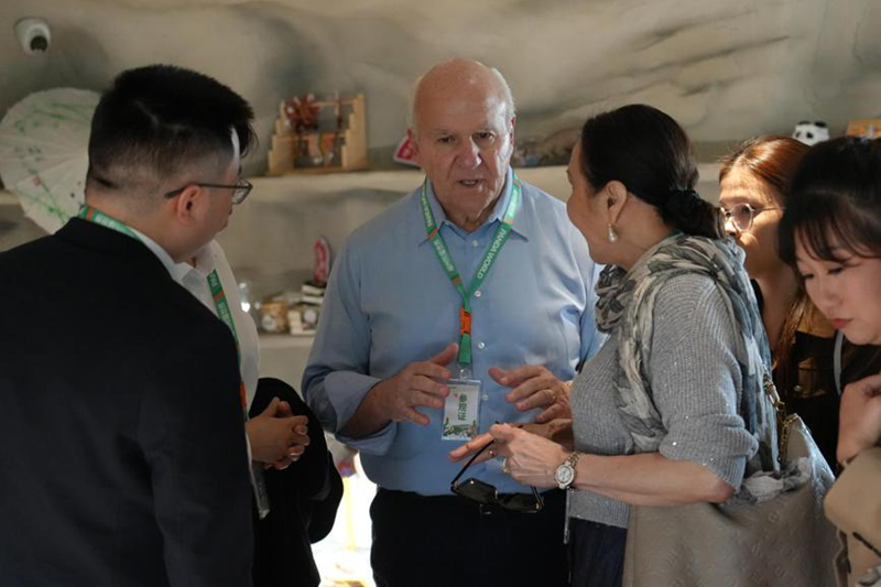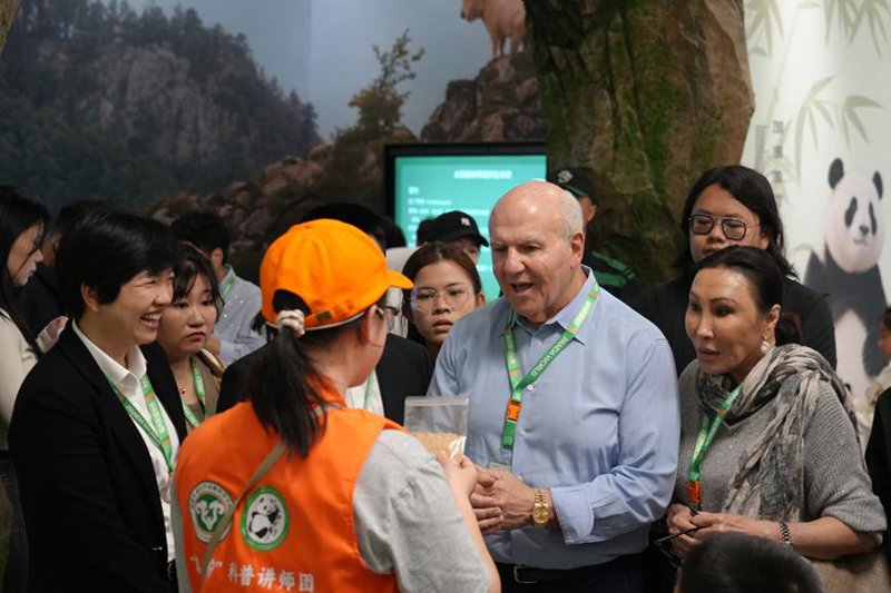 Honolulu Mayor Rick Blangiardi visits the exhibition hall at Fuzhou Panda World, asking about the feeding methods of pandas. [Photo by Qiu Yuwen / for chinadaily.com.cn]