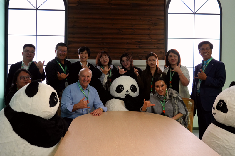 Rick Blangiardi and his wife, Karen Chang, take a photo with the staff members in Fuzhou Panda World. [Photo by Qiu Yuwen / for chinadaily.com.cn]