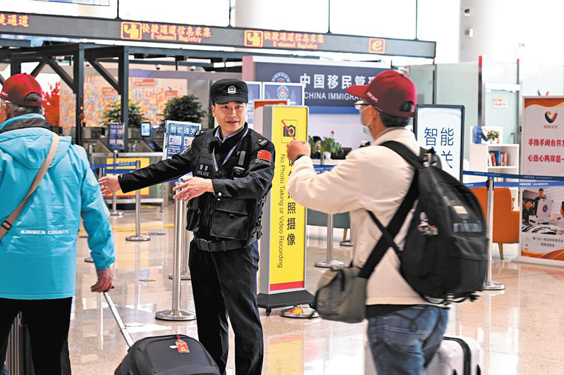 An immigration officer helps a group of Guan Yu Temple pilgrims from Taiwan enter the mainland in Xiamen, Fujian. [Photo provided to CHINA DAILY]