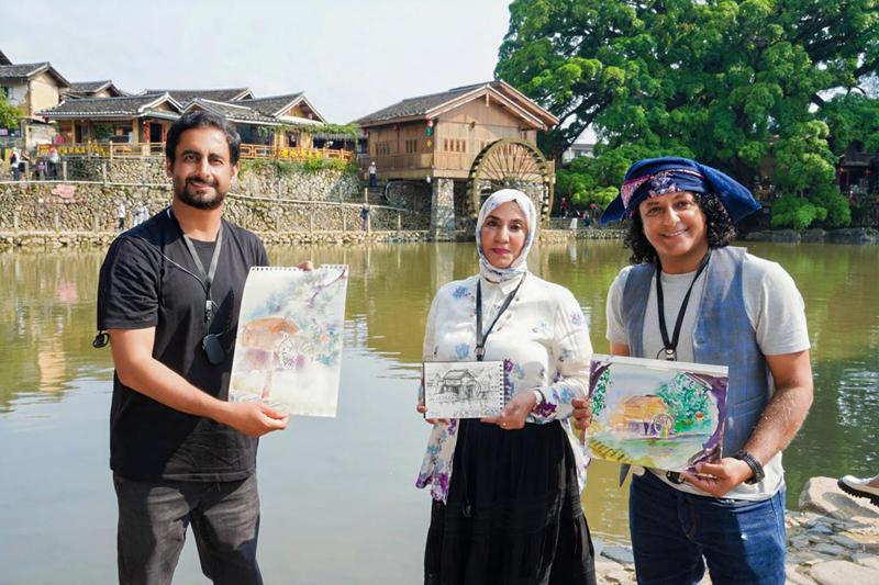 Arab artists conduct a field study and artistic creation session amid the historic Tulou clusters in Nanjing county, Zhangzhou, Fujian. [Photo provided to chinadaily.com.cn]