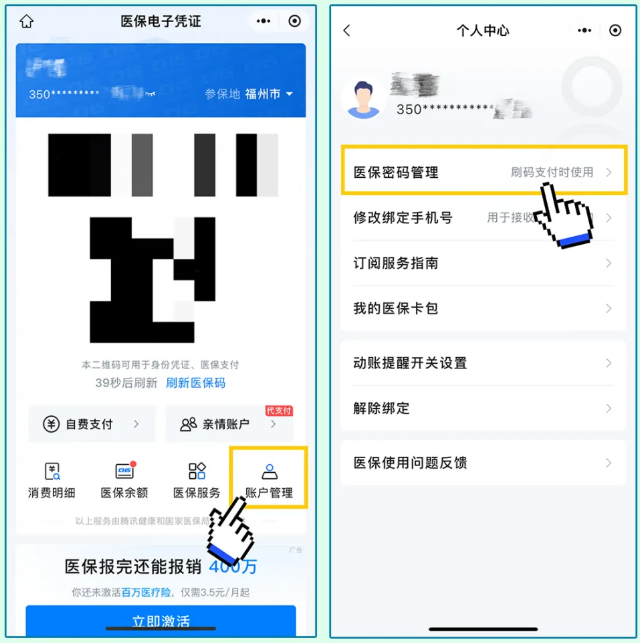步骤2:点击【账户管理】进入个人中心页面,再点击【医保密码管理】。