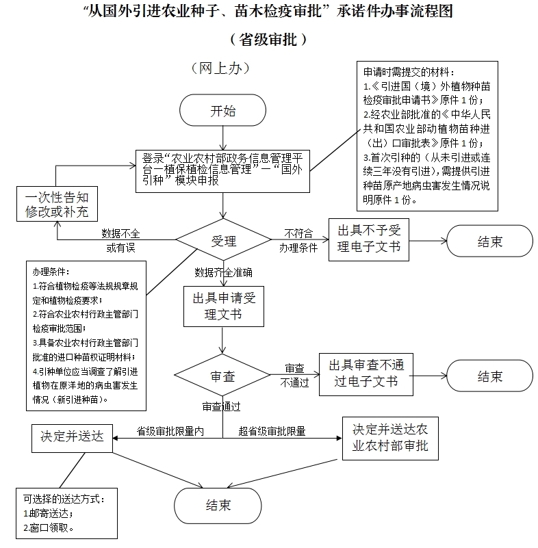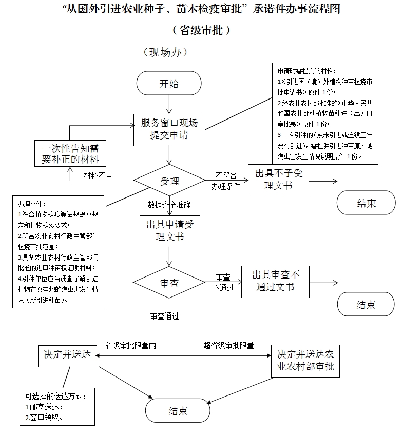 (4)决定:省级审批:作出准予许可决定,发放《国(境)外引进农业种苗检疫审批单》并送达,办理时限1个工作日;