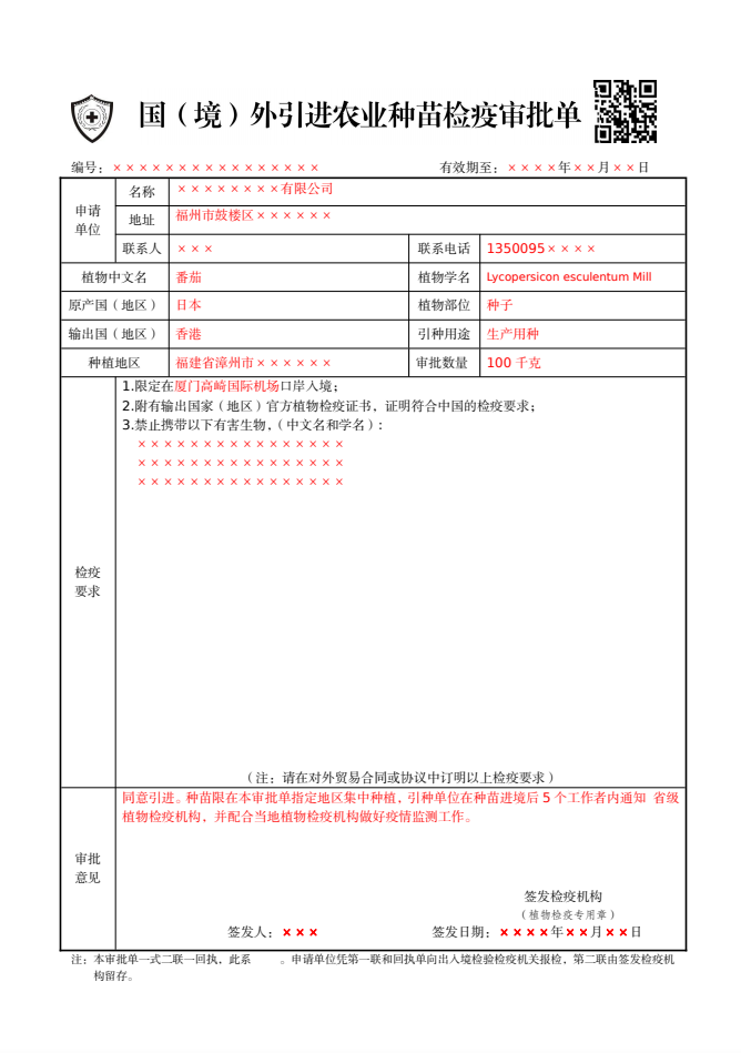 (2)经农业农村部批准的《中华人民共和国农业农村部动植物苗种进(出)口审批表》。引种单位(个人)向农业农村部申请后批准盖章。