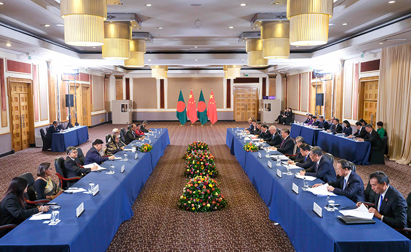 习近平指出,中国和孟加拉国传统友好。2016年我们将中孟关系提升为战略合作伙伴关系,为两国深化合作指明了方向。当前,中孟两国都处在各自发展振兴的关键阶段。中方愿同孟方加强发展战略对接,深化各领域务实合作,推动中孟战略合作伙伴关系迈上新台阶,给两国人民带来更多福祉。