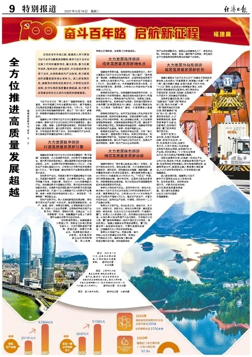 在党的百年华诞之际,福建深入学习贯彻习近平总书记重要讲话精神,秉承习近平总书记在闽工作时的重要理念、重大实践,着力在数字经济、海洋经济、绿色经济、外向型经济等方面下功夫,加快构建现代产业体系,努力提高经济质量效益和核心竞争力。进入新发展阶段,福建将加快转变发展方式,不断优化经济结构,全方位推进高质量发展超越,奋力谱写全面建设社会主义现代化国家的福建篇章。