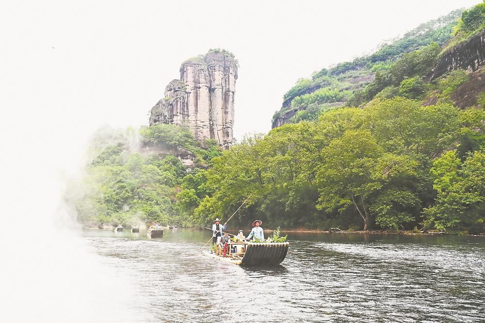 游客在世界自然和文化双遗产的武夷山国家公园内的九曲溪乘坐竹排体验漂流(资料照片)。新华社