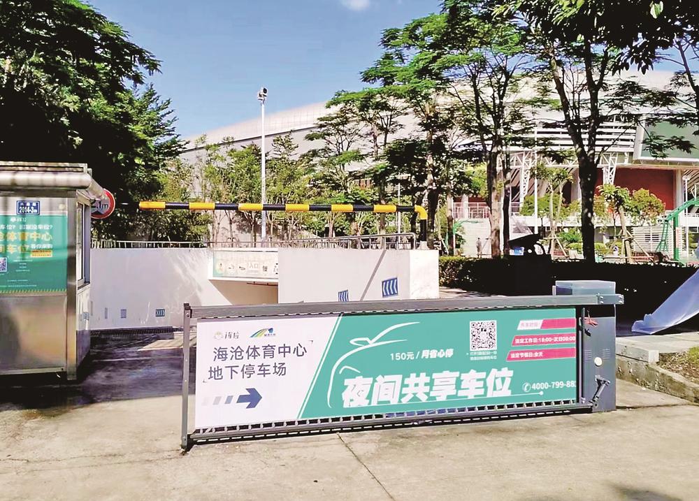 海沧体育中心地下车库闸口处,贴着扫码预约夜间共享车位的宣传。(资料图片)