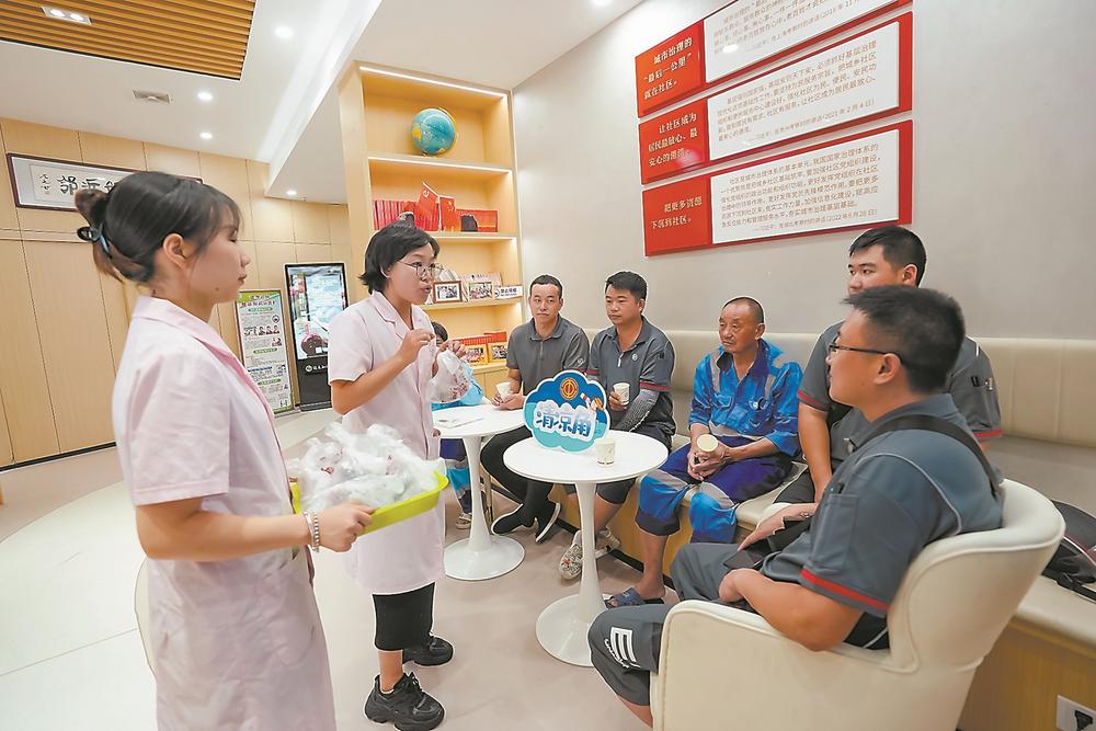 16日,在福州市鼓楼区水部街道建华社区爱心工会驿站,中医医生、社区志愿者向环卫工人、快递小哥等户外劳动者赠送精心调配的中药解暑汤药,帮助他们防暑降温。图为医生讲解防暑知识。(谢贵明 摄)