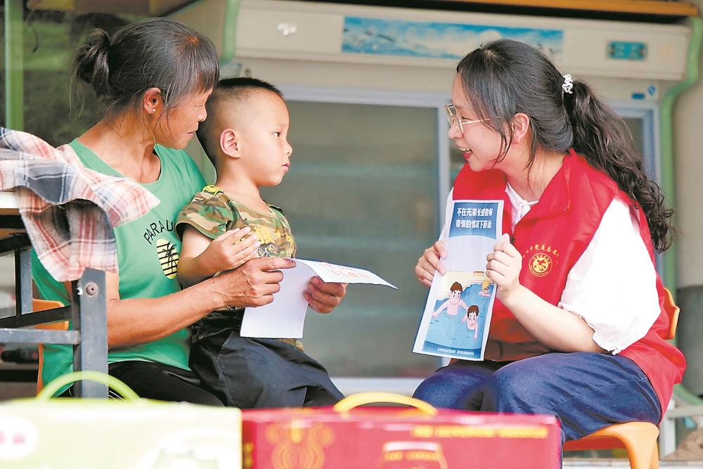 暑假期间,溺水事故进入易发、高发期,德化县桂阳乡针对返乡儿童增多现象,组织平安志愿者进村入户开展“清凉家访”。图为志愿者向彭坑村返乡儿童及家长送去防暑慰问品,并宣传防溺水知识。(吴朝烨 许华森 摄)