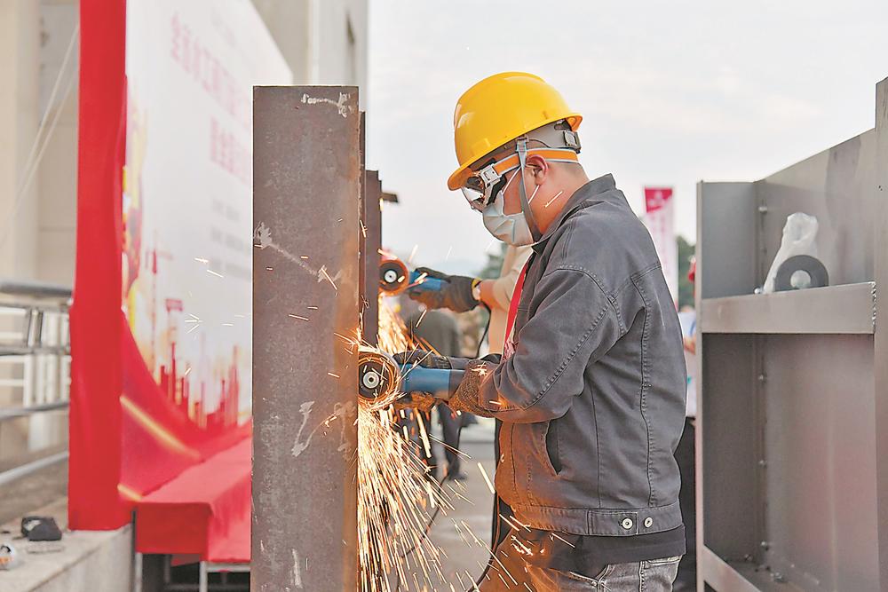 参赛选手在进行角磨机打磨作业技能操作竞赛。