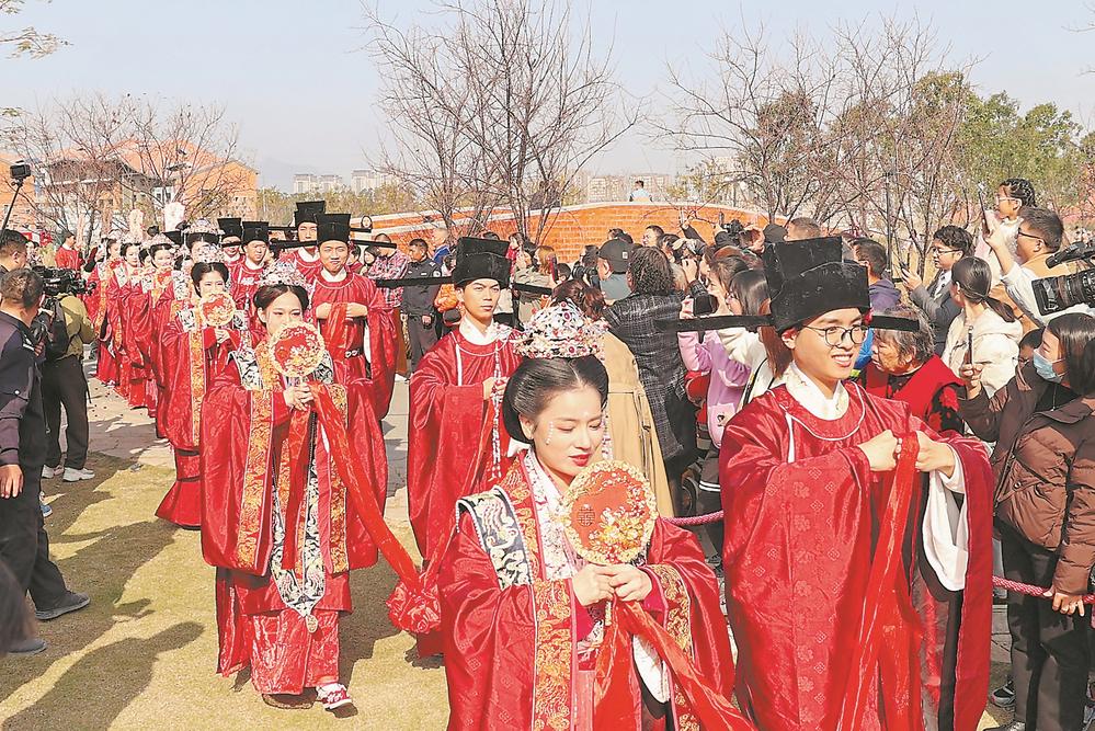 1日,晋江市池店镇田洋村披红挂彩、喜气洋洋,2025元旦九十九溪田园风光闽南传统婚俗体验秀活动在此举行。活动现场,9对新人携亲友热情参与,上千市民现场观礼,共同见证这场极具闽南传统风味的婚典秀。本次活动由晋江市委宣传部、晋江经济报社等共同主办。福建日报报业集团记者 曾舟萍 陈巧玲 摄