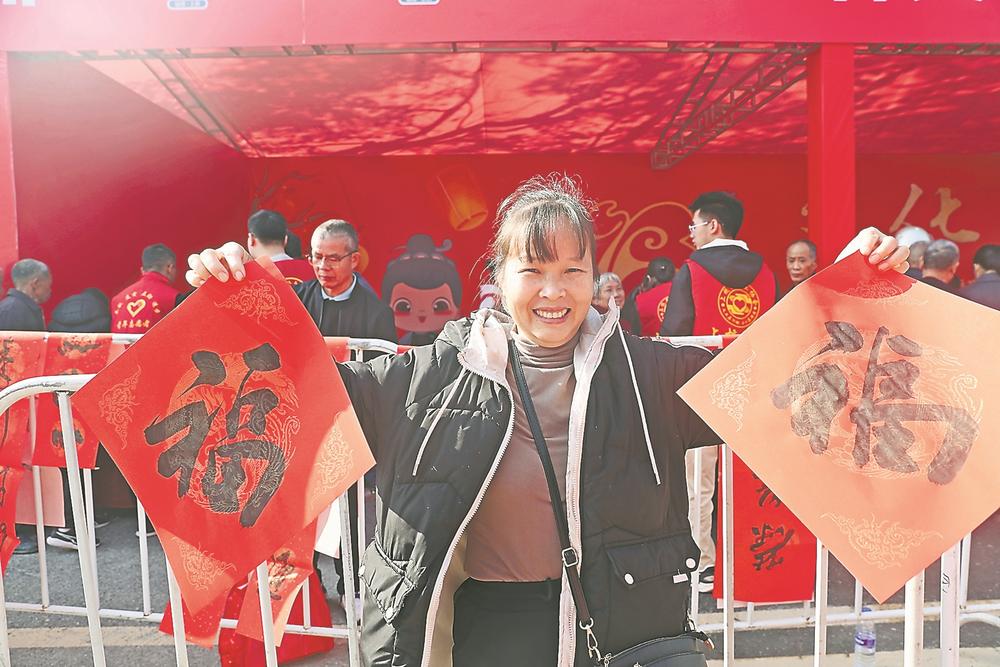 “福”文化喜气洋洋。省委宣传部服务点前,大家排起长队领取“福”文化帆布袋、围巾、中国结等;省文联服务点前,工作人员给大家写下一副副饱含祝福的春联;拓印体验活动台前,古籍修复师指导大家拓印“福”字……