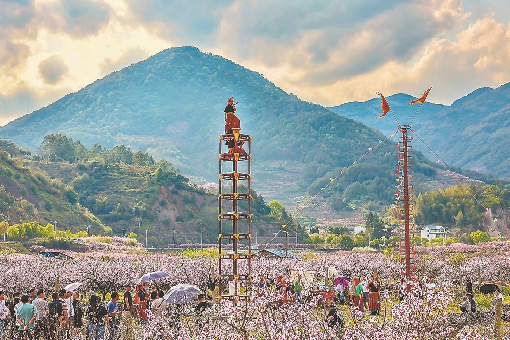 25日,在福安市穆云畲族乡虎头村,村民在桃园里举行畲族民俗绝技“起洪楼”展演,吸引众多游客。据介绍,“起洪楼”是畲族祭祀仪式,祈祝风调雨顺、四季平安。(记者 单志强 通讯员 李郁 吴景华 摄)