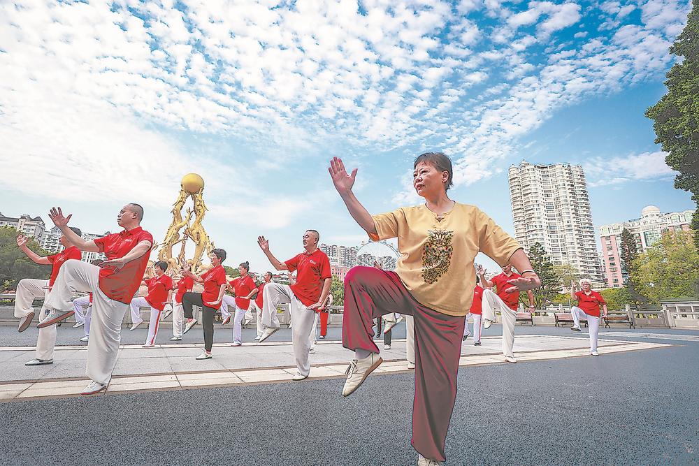 8日,在漳州市芗城区九龙公园晨练点,市民正在锻炼。近年来,随着生活水平和健身环境的提升,越来越多的市民投入健身运动。据统计,芗城区现有体育场地1897个,经常参加体育锻炼人数超30万人,全民健身运动蓬勃发展。(通讯员 郑文典 摄)