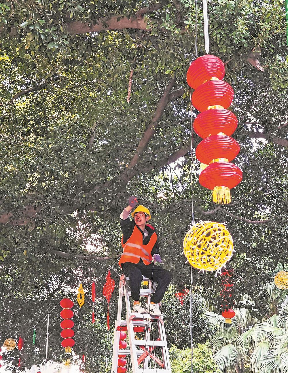 5日,福州市鼓楼区华林路,市政工人在沿街的大榕树上悬挂灯笼彩灯,装点街道。春节临近,年味渐浓。(记者 游庆辉 摄)