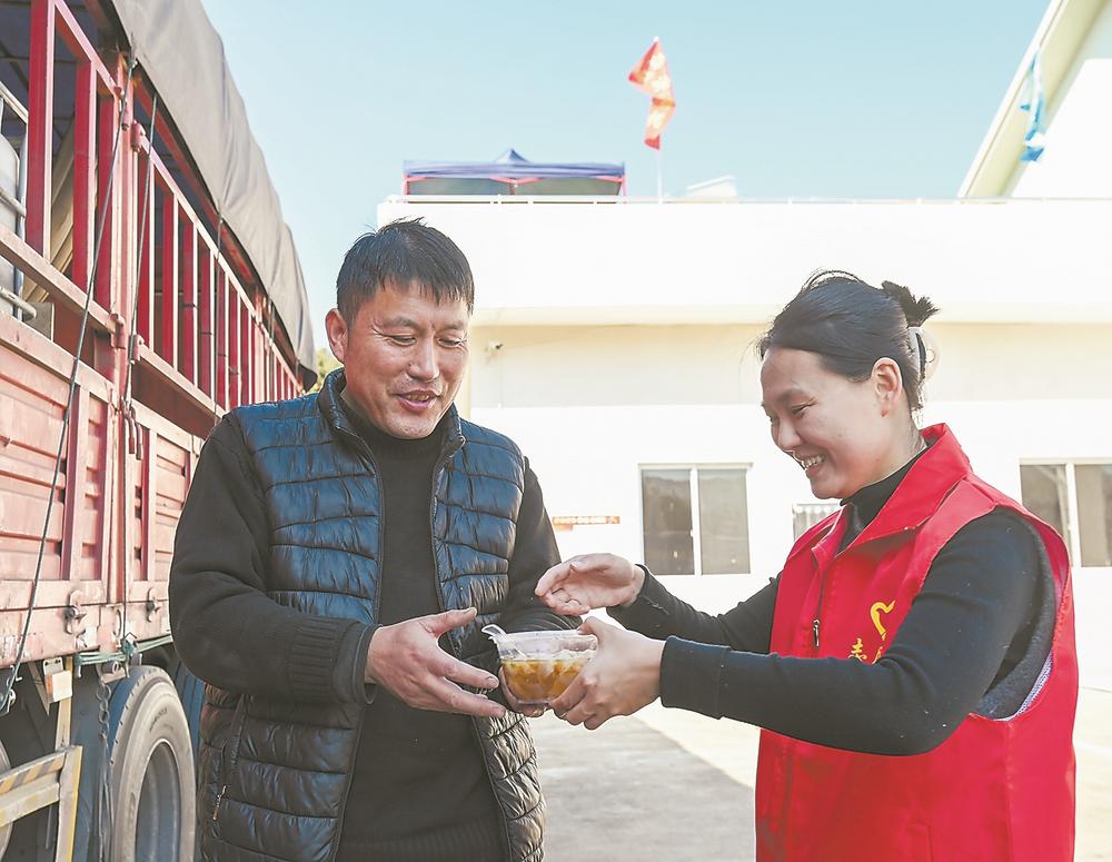 今年春运期间,全省普通公路将开放90个服务点和20个“共享司机之家”,免费为过往旅客提供多样化服务。图为14日,志愿者在回龙服务区为过往司乘人员送上当地水吉扁肉、建瓯光饼等特色小吃。(记者 张颖 通讯员 陈勤思 袁燕飞 摄)