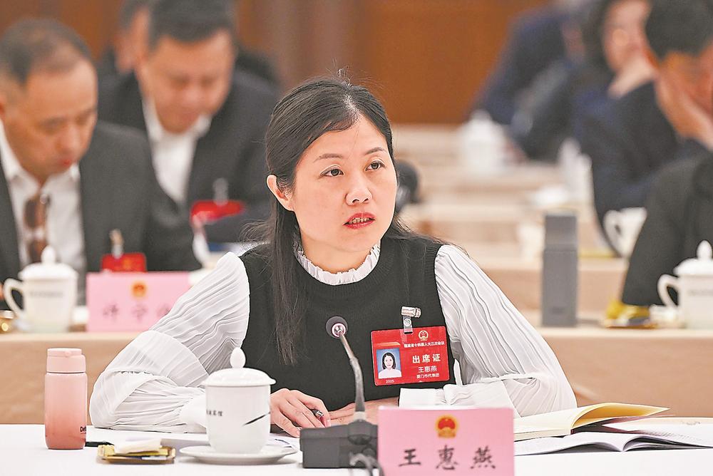 王惠燕代表建议:出台指导性文件,为农村一二三产业融合发展特别是土地利用提供依据;资源规划部门在地类变更时应充分征求农业部门意见;健全村集体建设用地纠纷解决机制。(记者 游庆辉 摄)
