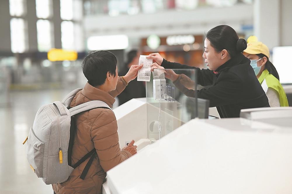 春运期间,福州火车站在候车厅服务台增加人员,做好旅客的引导和咨询工作。(邹海杰 摄)