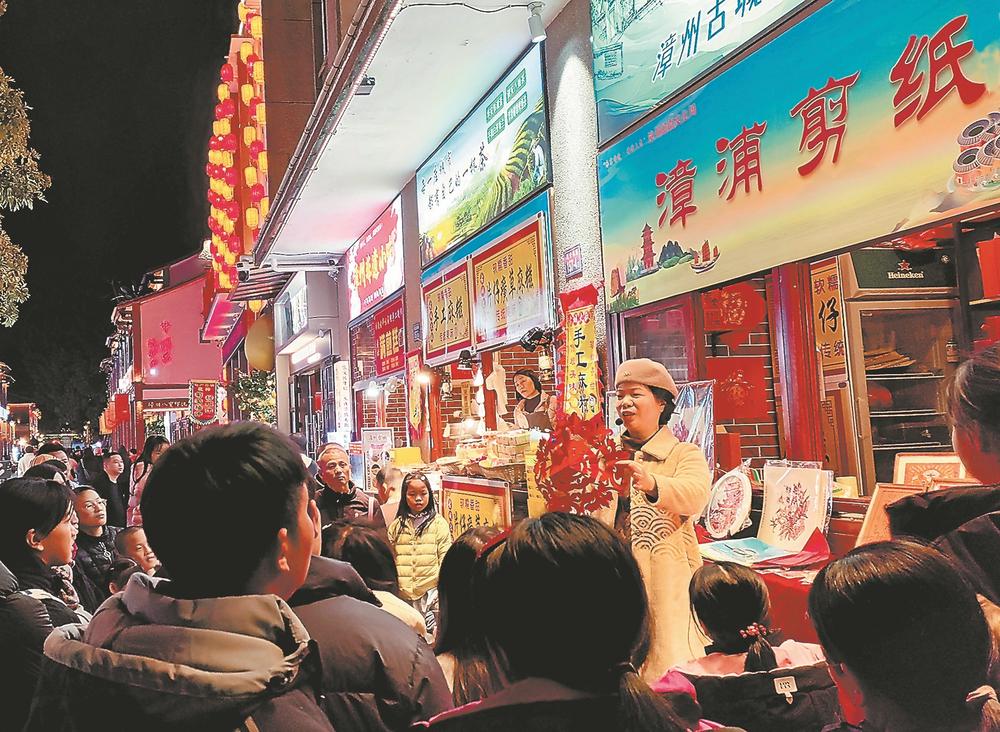 近日,游客在漳州古城观看非遗剪纸技艺展示。(报业集团记者 萧镇平 通讯员 郑文典 摄)