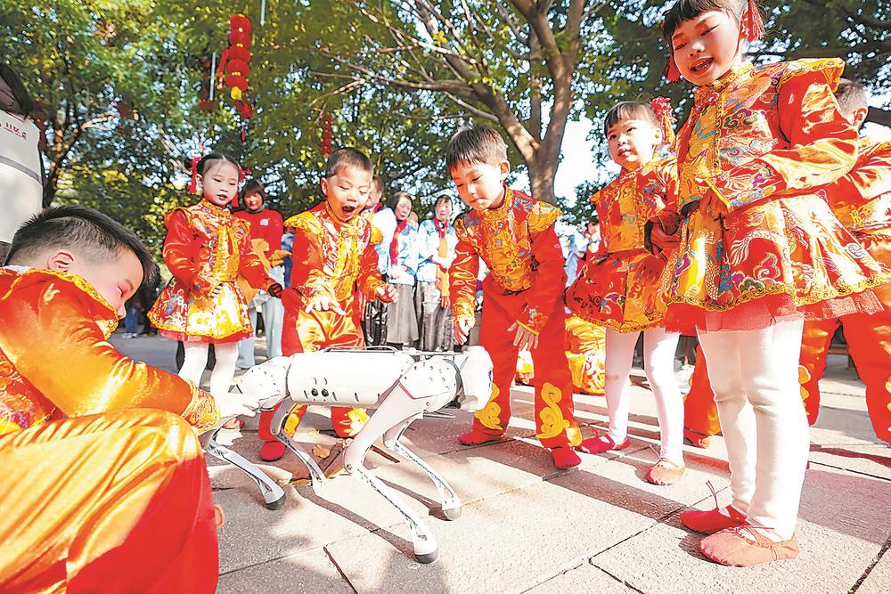 日前,福州市鼓楼区鳌峰坊文化广场举行新年文化活动,孩子和智能机器狗互动。(谢贵明 摄)
