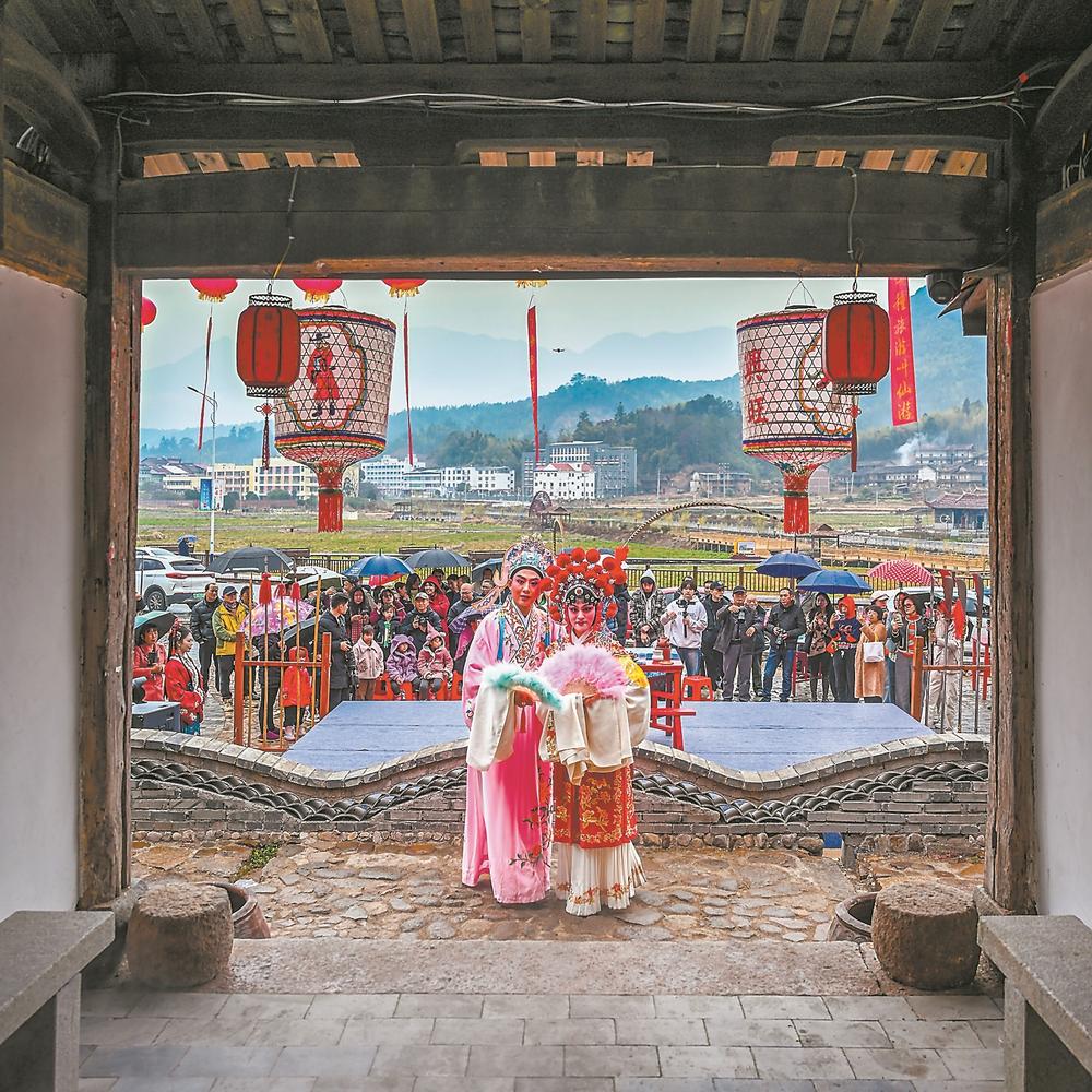 春节临近,仙游县菜溪乡岳氏古厝举办文化非遗“巳”集,以此迎新纳福。图为演员为村民带来莆仙戏表演。(报业集团记者 林鹏 陈阳阳 通讯员 张力 摄)