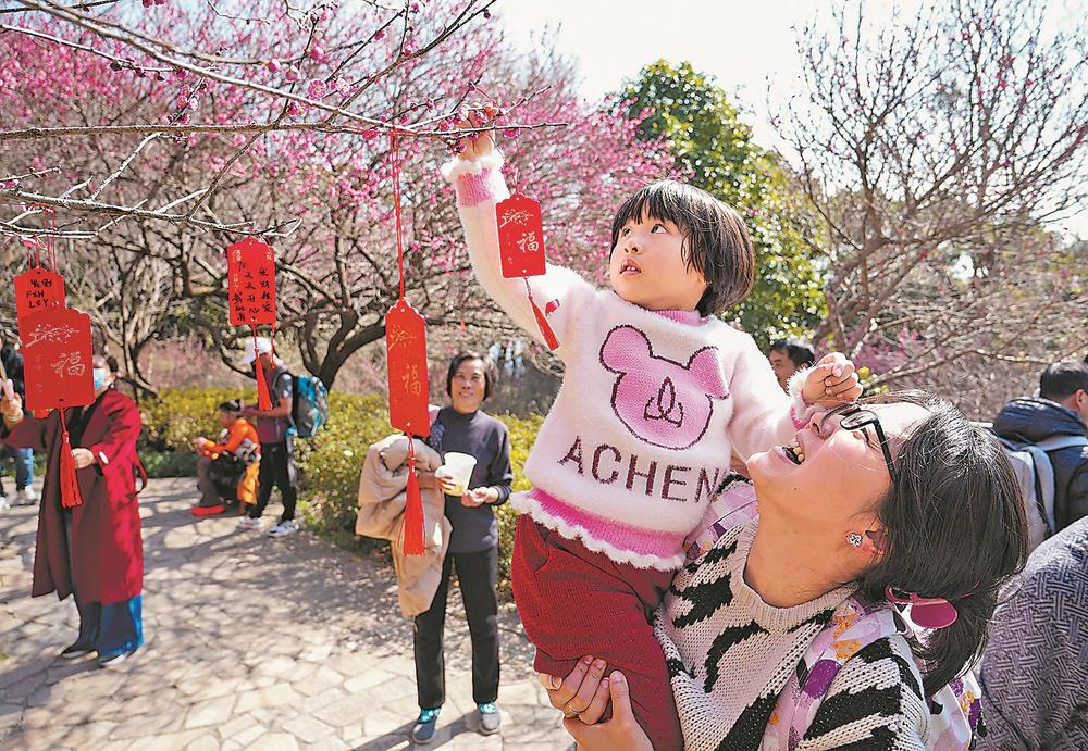 福州鼓山旅游景区梅里景区的3000多株梅花近期逐渐进入盛花期,吸引了众多游客前来观赏。图为游客在梅里景区挂福牌祈安康。(记者 游庆辉 摄)