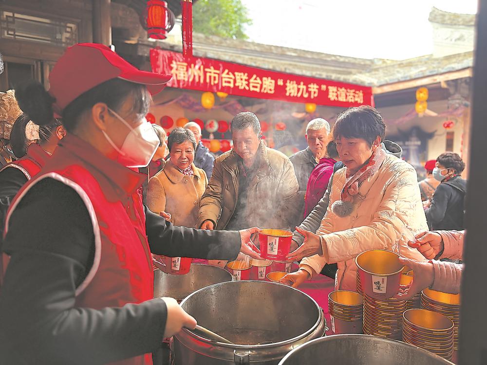 26日,在位于福州三坊七巷的台湾会馆,由糯米、红糖、花生、红豆、马蹄、桂圆等熬成的拗九粥香味四溢。“今天吃一碗拗九粥,祝大家平安健康!”在2025年在榕台胞拗九节活动中,志愿者一边为老人家送上拗九粥,一边送上暖心的祝福。