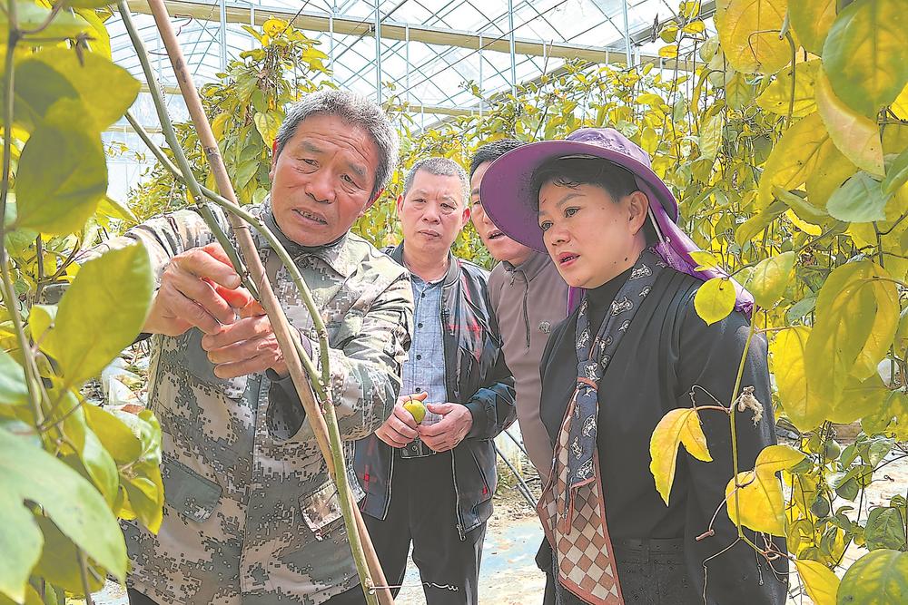 当前,大棚果蔬进入春管关键时期。2月24日,龙岩市永定区湖坑镇江昊农业科技园内,有着十几年百香果种植经验的“土专家”江撒旦(左一)、江裕煌(左二)为种植户指导“亲密9号”百香果截枝技术,并现场查看苗情、墒情,传授病虫害防治技术,助力农业生产提质增效。