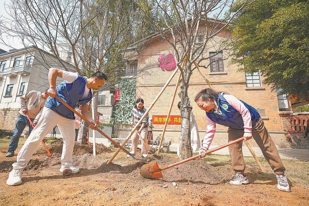 12日,“两岸一家亲 共建同胞林”义务植树主题活动在福州冶山春秋园内举办,台胞、社区居民、志愿者共80多人参与,大家以实际行动为榕城植树添绿。(通讯员 谢贵明 摄)