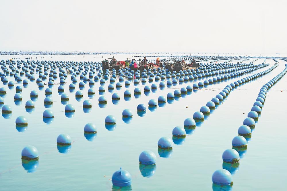 3月12日,渔民在连江县苔菉镇附近海域给鲍鱼投喂龙须菜。近日,随着天气转暖,海水温度逐渐升高,“中国鲍鱼之乡”连江县迎来了鲍鱼投苗的最佳时节。渔民抢抓农时,将鲍鱼苗投放入海,掀起海上春耕生产热潮。(林善传 摄)
