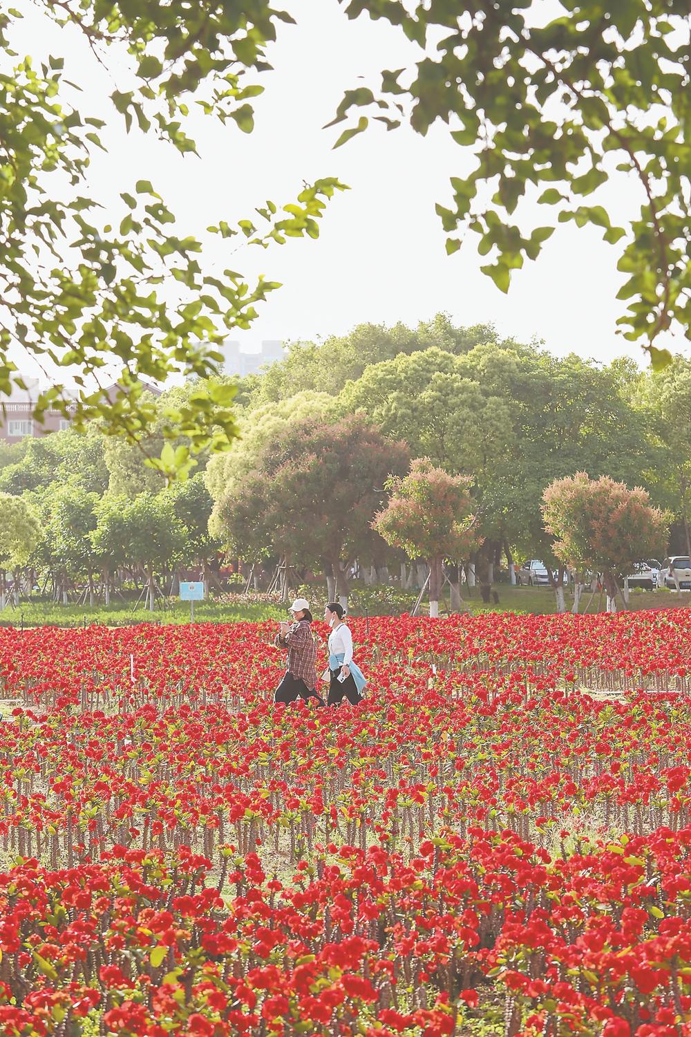 春日里,泉州市丰泽区马可·波罗广场上成片的铁海棠植株紧密相连,形成了火红的花海。图为市民在花海中拍照留念。(张婧滢 陈懿 庄钊滢 摄)