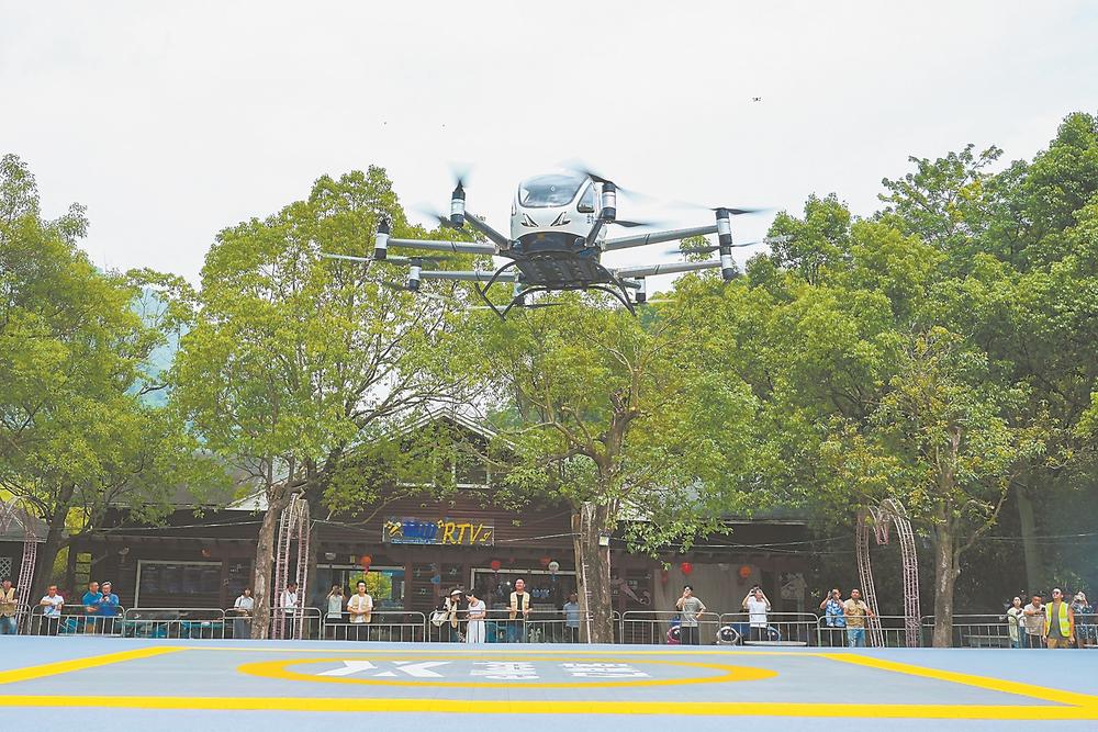 19日,2025年漳州市文旅经济发展大会在漳州市长泰区十里蓝山景区召开。大会现场启动了“空中看漳州”项目,一架无人驾驶载人航空器在首飞过程中平稳完成了垂直升降与环绕飞行。(记者 施辰静 摄)