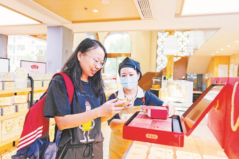 国庆中秋假期,龙岩月饼消费市场持续升温。今年的月饼礼盒不仅在包装上更加简约环保,价格也更为亲民。图为消费者在选购月饼。(记者 徐士媛 通讯员 邓佳佳 摄)