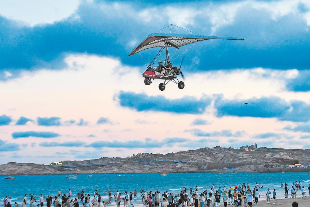 国庆中秋假期,平潭精心策划推出了一系列文旅活动,打造能玩、能逛、能买的多元消费场景。此外,平潭还推出门票减免、折扣优惠等便民惠民举措,持续释放假日文旅消费活力。图为在龙王头海洋公园,游客乘坐动力三角翼从高空俯瞰平潭美景。(报业集团记者 张哲昊 通讯员 江信恒 摄)
