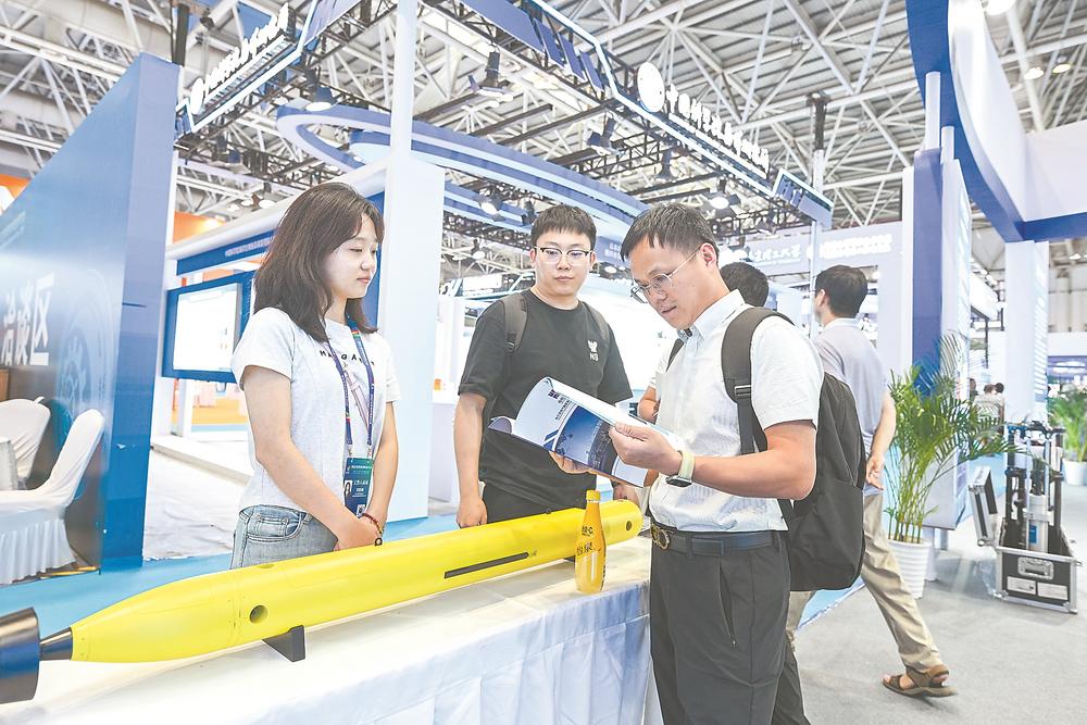在哈尔滨工程大学展区,工作人员正在为观众介绍水下无人航行器。(陈天博 摄)