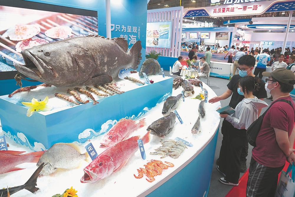 2日,中国(福州)国际渔业博览会现场展示各种海鲜产品。新华社